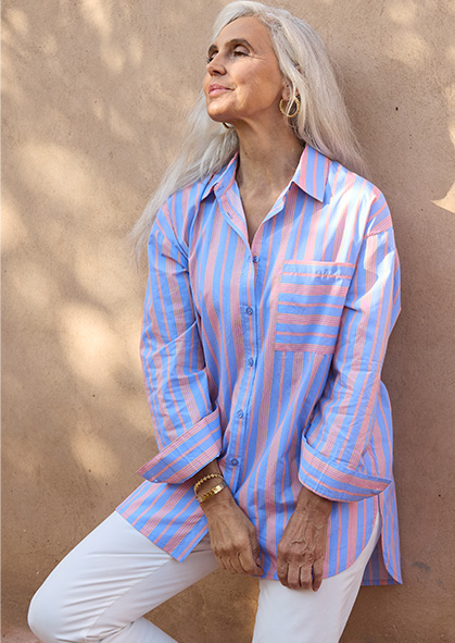 Associée à des tons clairs — écru, bleu ciel, beige — la rayure gagne en légèreté et illumine la silhouette.