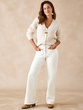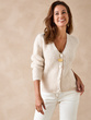 Le gilet écru s'offre un petit côté fantaisie, avec une jolie côte perlée et une maille légèrement brillante...
