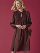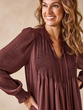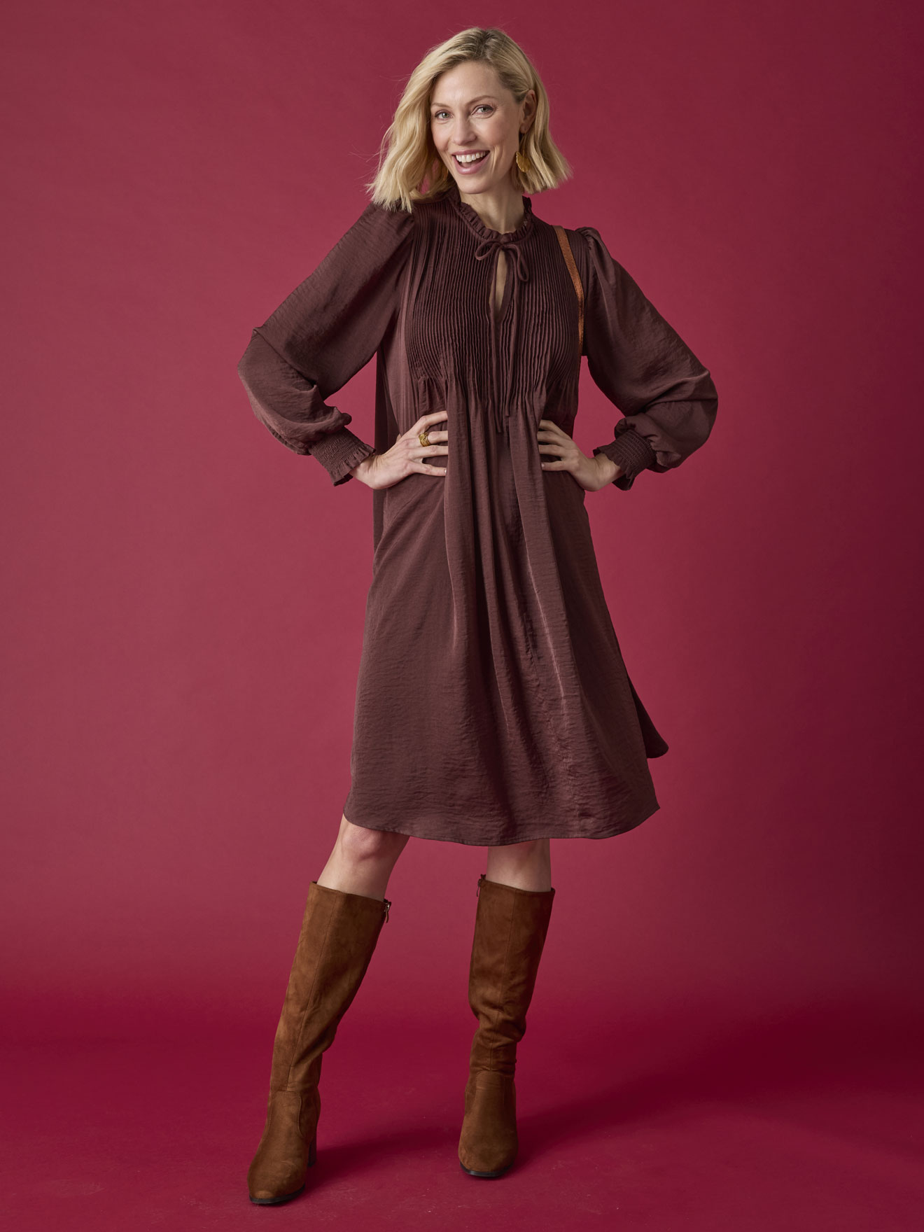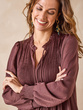 Un tissu satiné, un détail ruchet à l'encolure, des plis nervurés sur le devant pour le style autant que pour l'aisance, et des manches terminées par des smocks pour un effet légèrement...